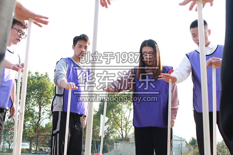 击鼓颠球又叫动感颠球、鼓动心声、鼓动人心,这是一个要求团队高度协作的项目,需要大家在短时间内制定出达到目标的方案,并在执行过程中协调一致。实际操作时,难免会遭遇排球落地、落绳子上,学员身上等失败的情况。这就要求队员们在认真负责的同时能够沉下心来,承受得住失败的挫折,越挫越勇,持之以恒,最终成功地完成任务。