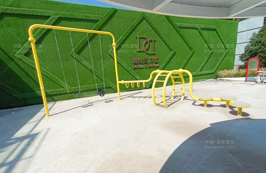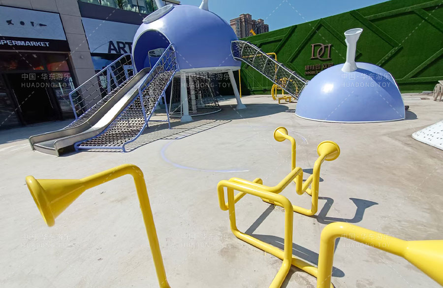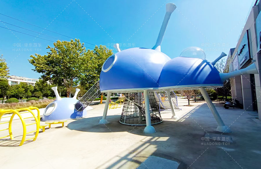 此次项目采用的是乐发游乐自主设计的飞碟主题的游乐设备,新增了传声筒、爬网、儿童秋千、钻洞、不锈钢滑梯等功能。