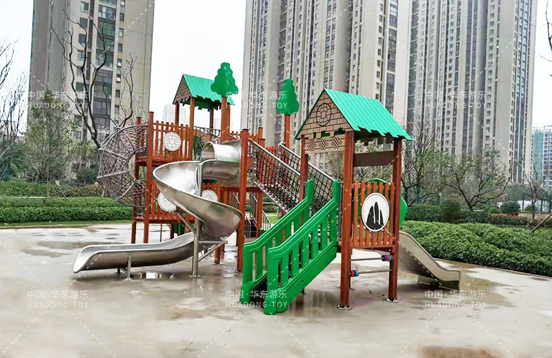 荣盛华府选用的是乐发游乐自主设计的具有攀爬网、U型爬网、不锈钢滑梯、网桥、滑桶为一体的综合性游乐设备。