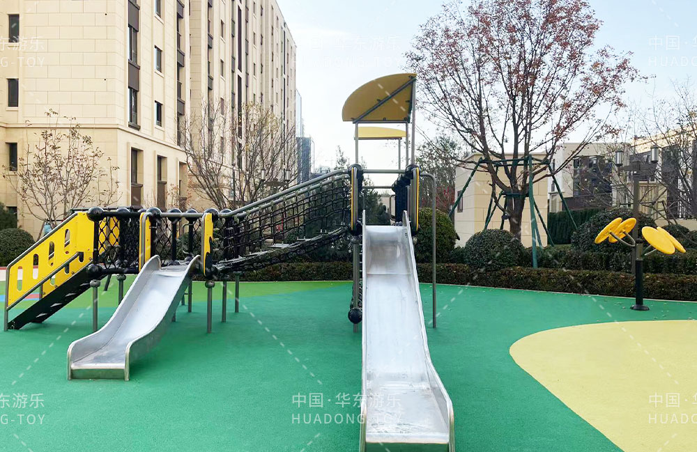太原华润昆仑域地产项目选用的是乐发游乐自主研发的游乐设备,娱乐场里选用了健身器材、具备攀爬网、不锈钢滑梯为一体的综合性游乐设备,为生活在该小区的人们提供了一个生活、休闲、娱乐的场所。