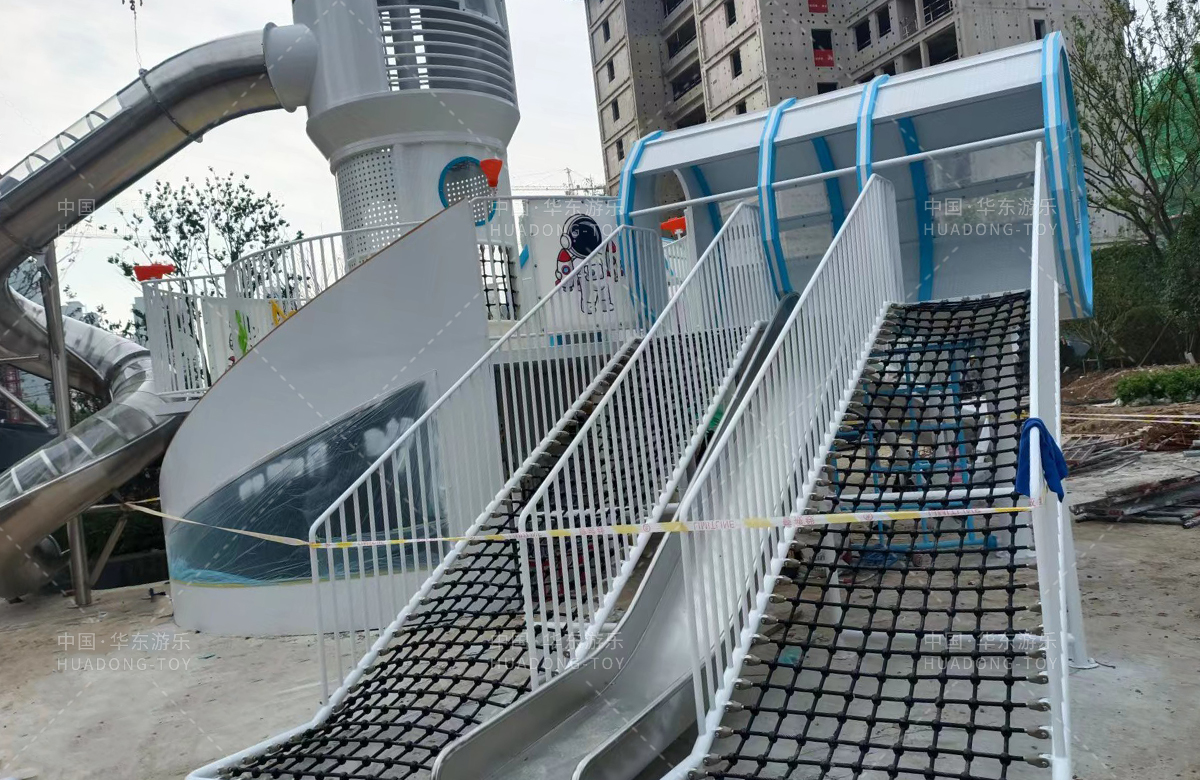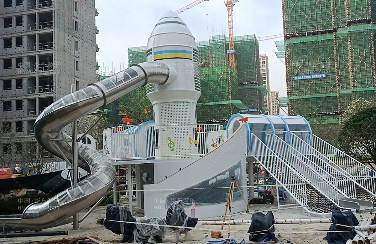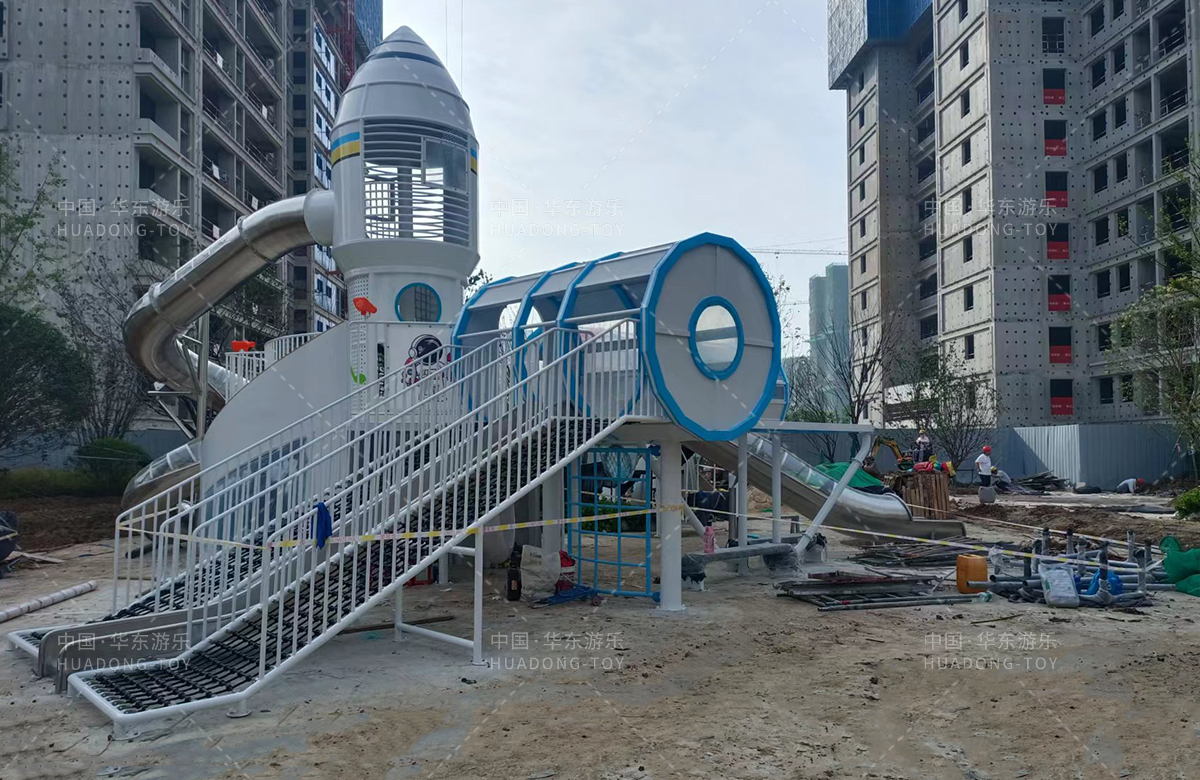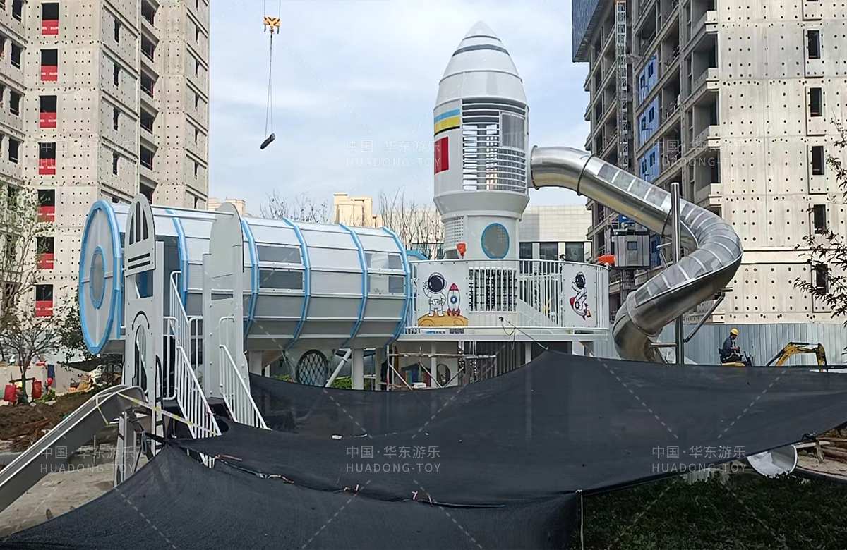 安徽省亳州市涡阳县荣徽上河郡选用的是乐发游乐自主研发和生产的以航天飞机为主题的大型非标定制的游乐设备,是一款具备了攀爬网、攀爬梯、旋转滑筒、儿童摇摇乐为一体的综合性儿童游乐场。