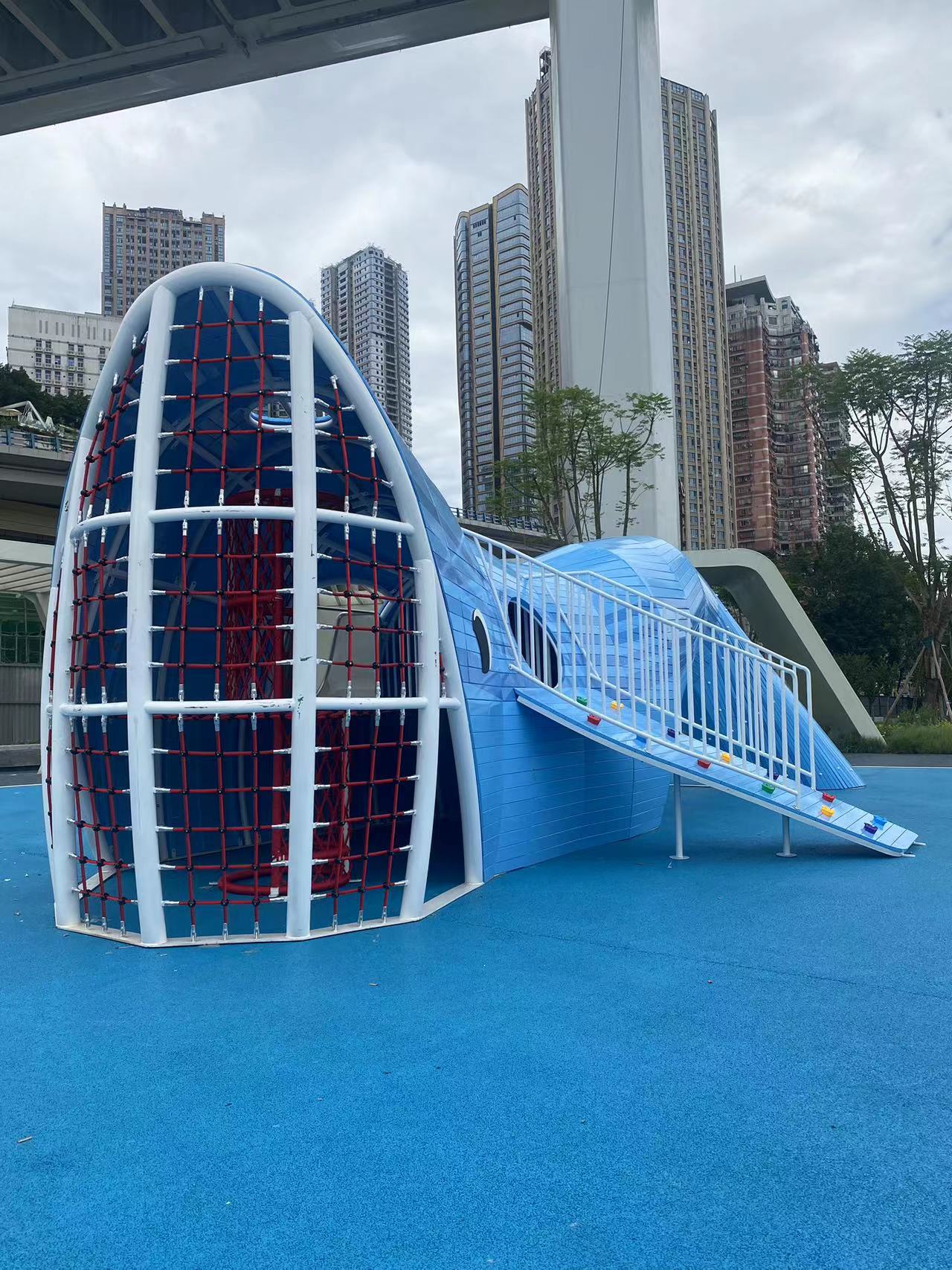 重庆市珊瑚公园是一个公益性的,专门为该区域游玩的人群提供休闲、娱乐的场所,此次选用的游乐设备是乐发游乐自助研发和设计的以大鲨鱼为主的非标定制设备,具备了攀爬网、攀爬墙、钻洞、不锈钢滑梯等功能。