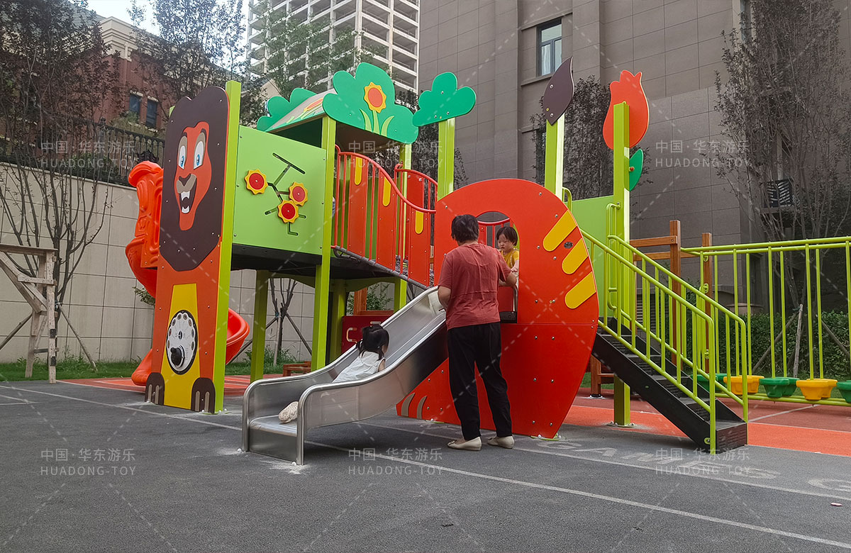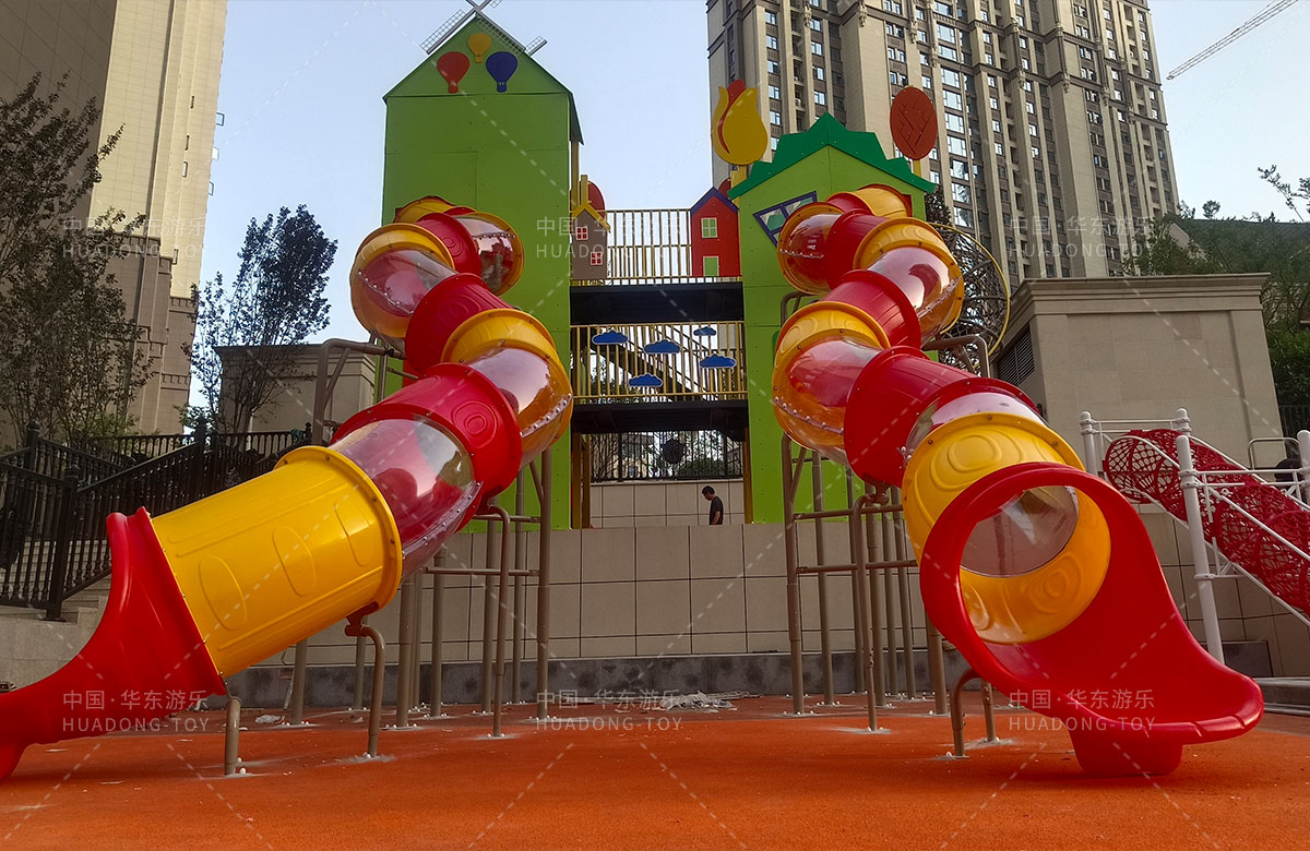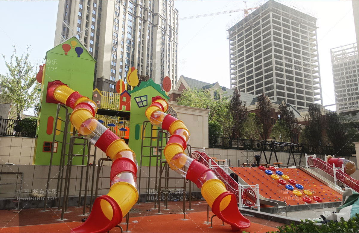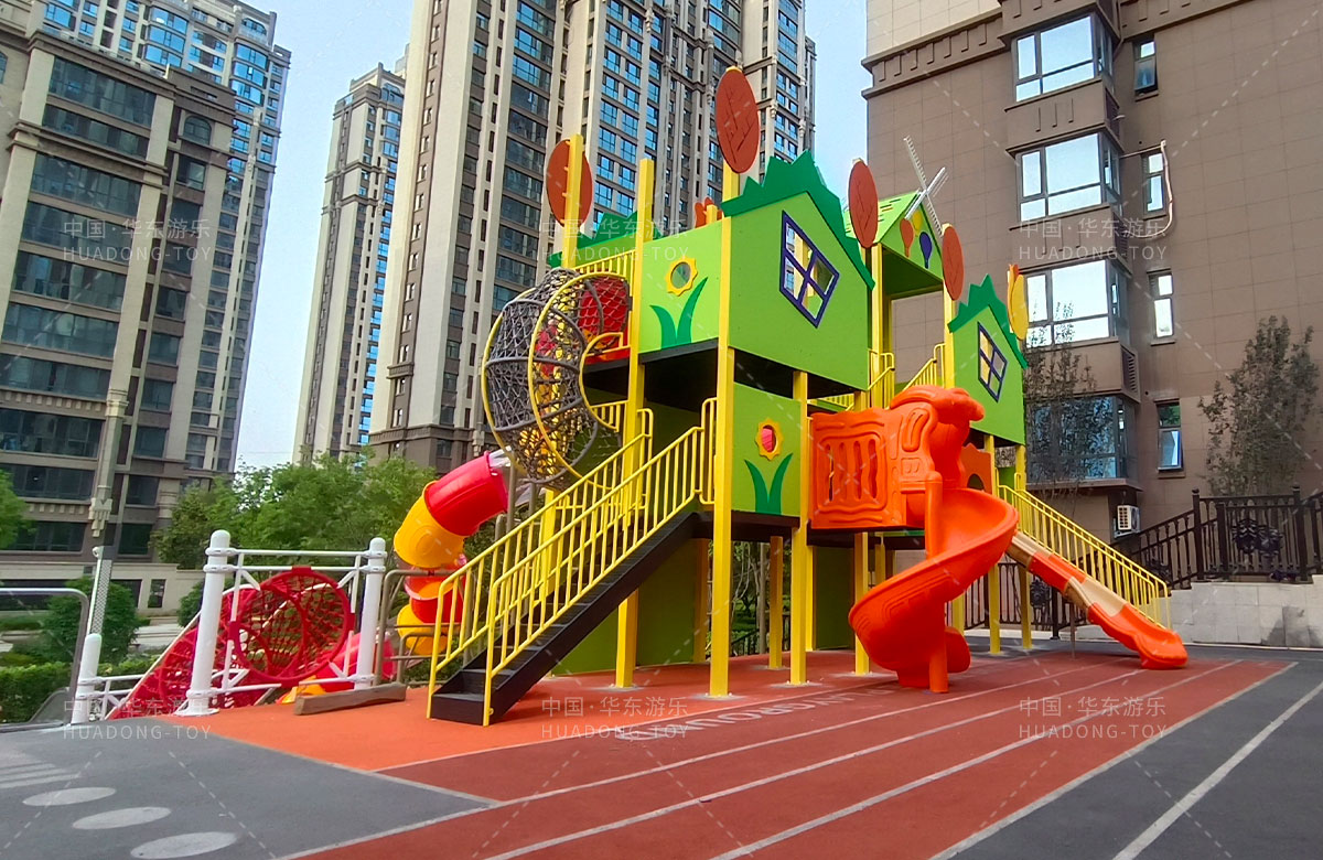 德福房地产骏景御园选用的是乐发游乐自主研发和生产的趣味小屋为主题的游乐设备,整个场地分别设置了小朋友喜欢的组合滑梯、旋转座椅、不锈钢滑梯、组合秋千、各种类型的拓展游乐设备,不仅仅丰富了小区的生活,也为孩子们的健康成长提供了保障。