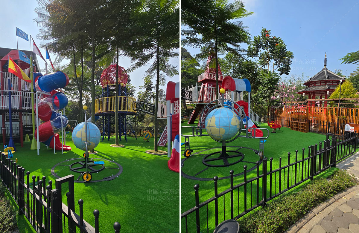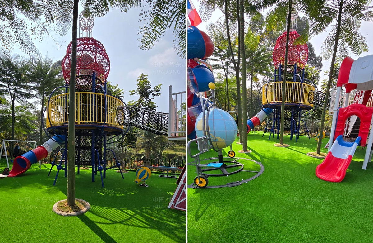 该项目选用的是乐发游乐自主研发和设计的跨国系列组合滑梯,该滑梯具备了攀爬网、钻洞、滑梯等功能,同时为了让整个游乐场变得更加具有生机与活力,整个项目还设置了小朋友喜欢的儿童摇摇乐、儿童跷跷板、以及地球旋转自行车等游乐设备,为当地的人群体提供了一个休闲娱乐的场所。