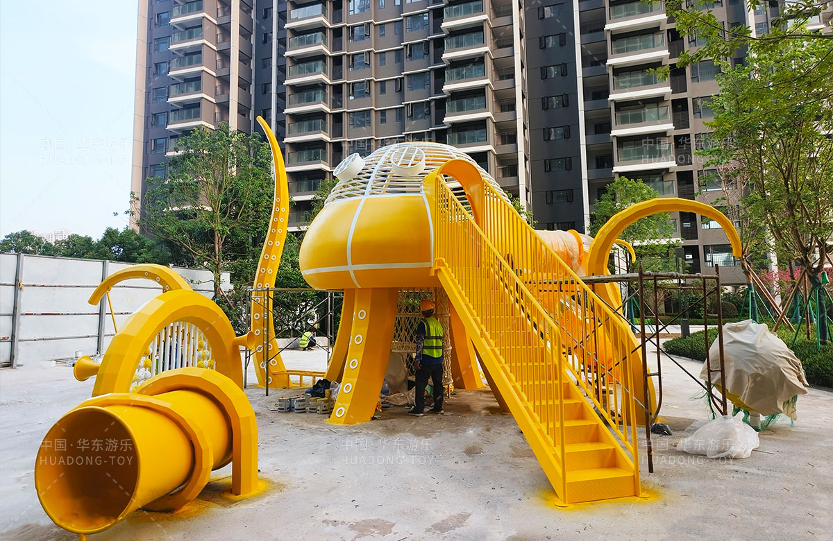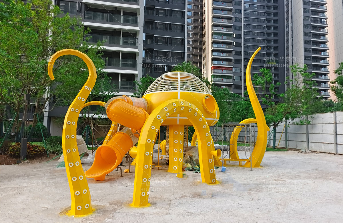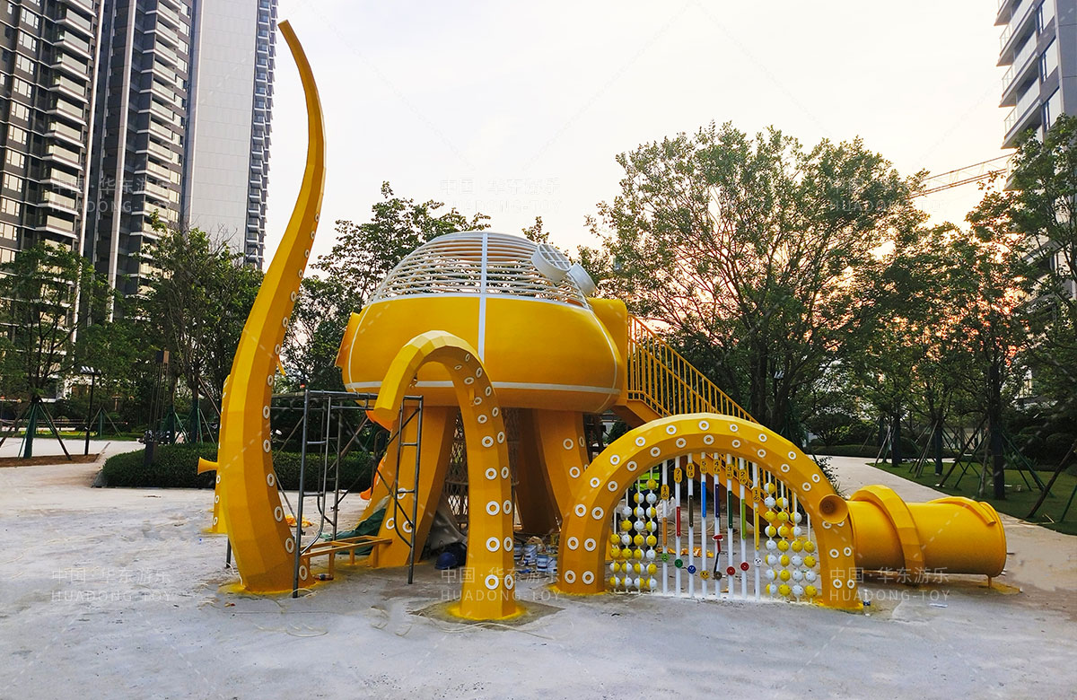 中海地产汕头阅江府选用的是乐发游乐自主研发和设计的以章鱼为主题而设计的非标定制的章鱼主题综合游乐园,整个游乐园用一个大型的章鱼设备为主题,设计了集钻洞、攀爬网、滑梯、打击乐器等功能为一体的综合性游乐设备,为生活在当地的人群提供了一个休息娱乐的场所,也为小朋友们的健康成长提供了保障。